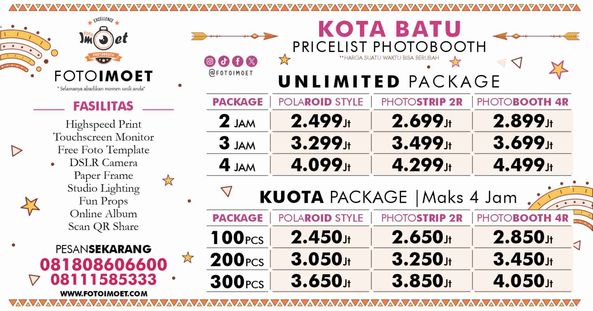 Batu - Ada 2 layanan harga photo booth murah Batu dari FOTOIMOET yaitu Paket photo booth unlimited dan Photo Booth Kuota, perbedaan nya ada di jam operasional dan banyak lembaran foto yang di cetak. Paket yang jumlah pemotretan tidak terbatas adalah photobooth unlimited, kamu bisa sepuasnya foto dan bergaya di depan kamera selama waktu operasional di paket harga photo booth unlimited Batu yang di pesan.