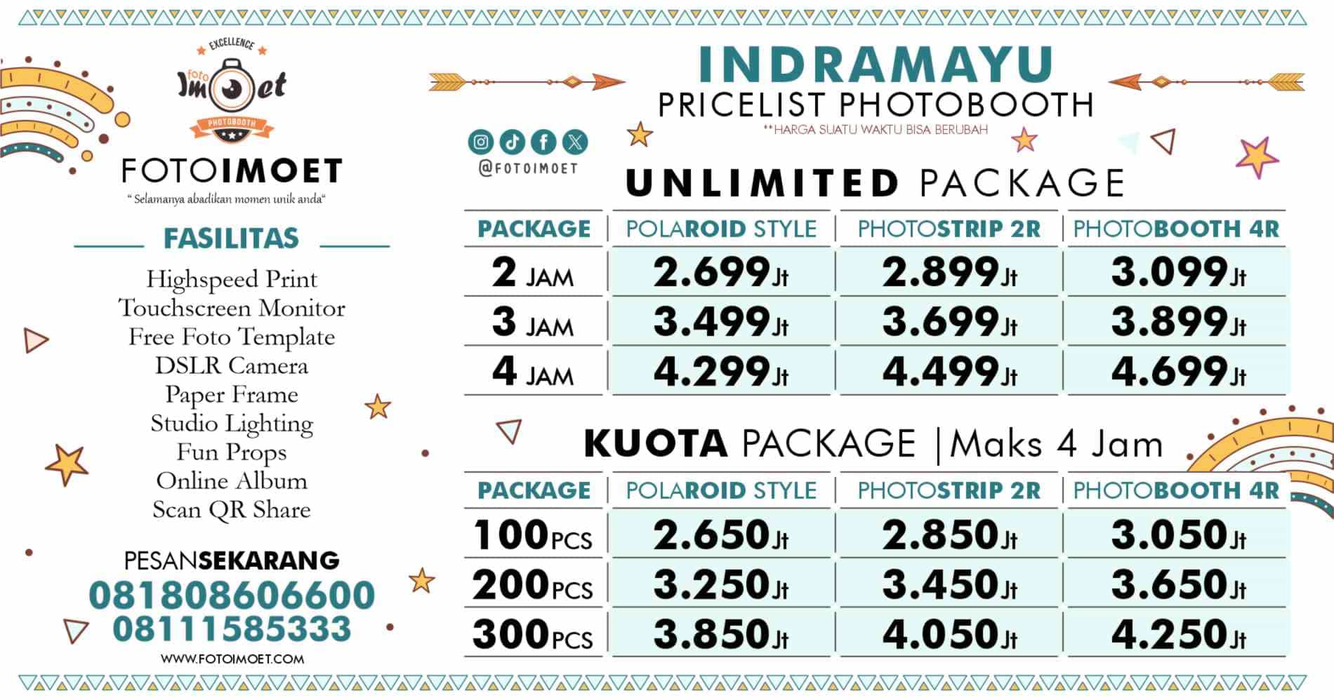Indramayu - Ada 2 layanan harga photo booth murah Indramayu dari FOTOIMOET yaitu Paket photo booth unlimited dan Photo Booth Kuota, perbedaan nya ada di jam operasional dan banyak lembaran foto yang di cetak. Paket yang jumlah pemotretan tidak terbatas adalah photobooth unlimited, kamu bisa sepuasnya foto dan bergaya di depan kamera selama waktu operasional di paket harga photo booth unlimited Indramayu yang di pesan.