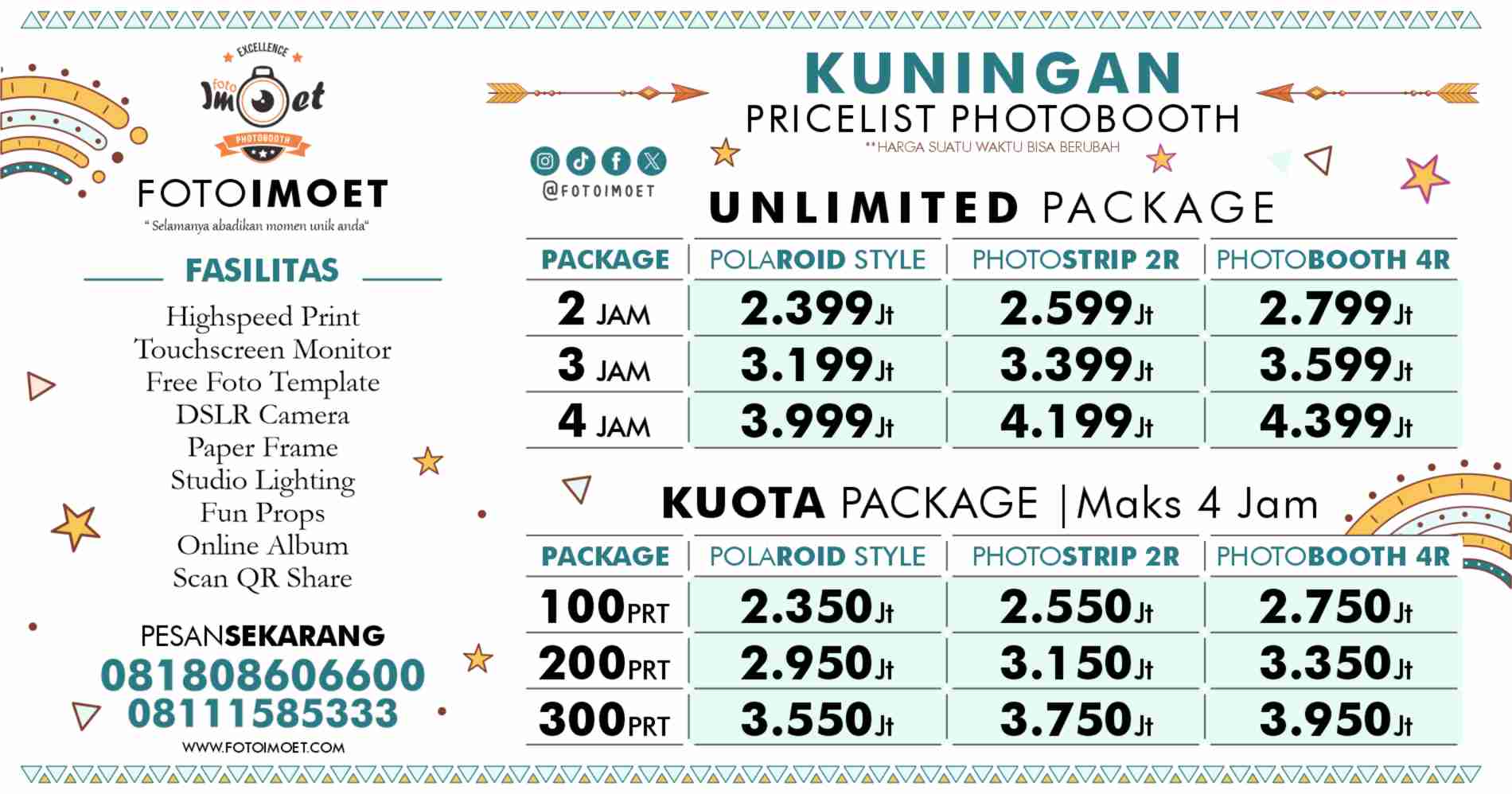 Kuningan - Ada 2 layanan harga photo booth murah Kuningan dari FOTOIMOET yaitu Paket photo booth unlimited dan Photo Booth Kuota, perbedaan nya ada di jam operasional dan banyak lembaran foto yang di cetak. Paket yang jumlah pemotretan tidak terbatas adalah photobooth unlimited, kamu bisa sepuasnya foto dan bergaya di depan kamera selama waktu operasional di paket harga photo booth unlimited Kuningan yang di pesan.