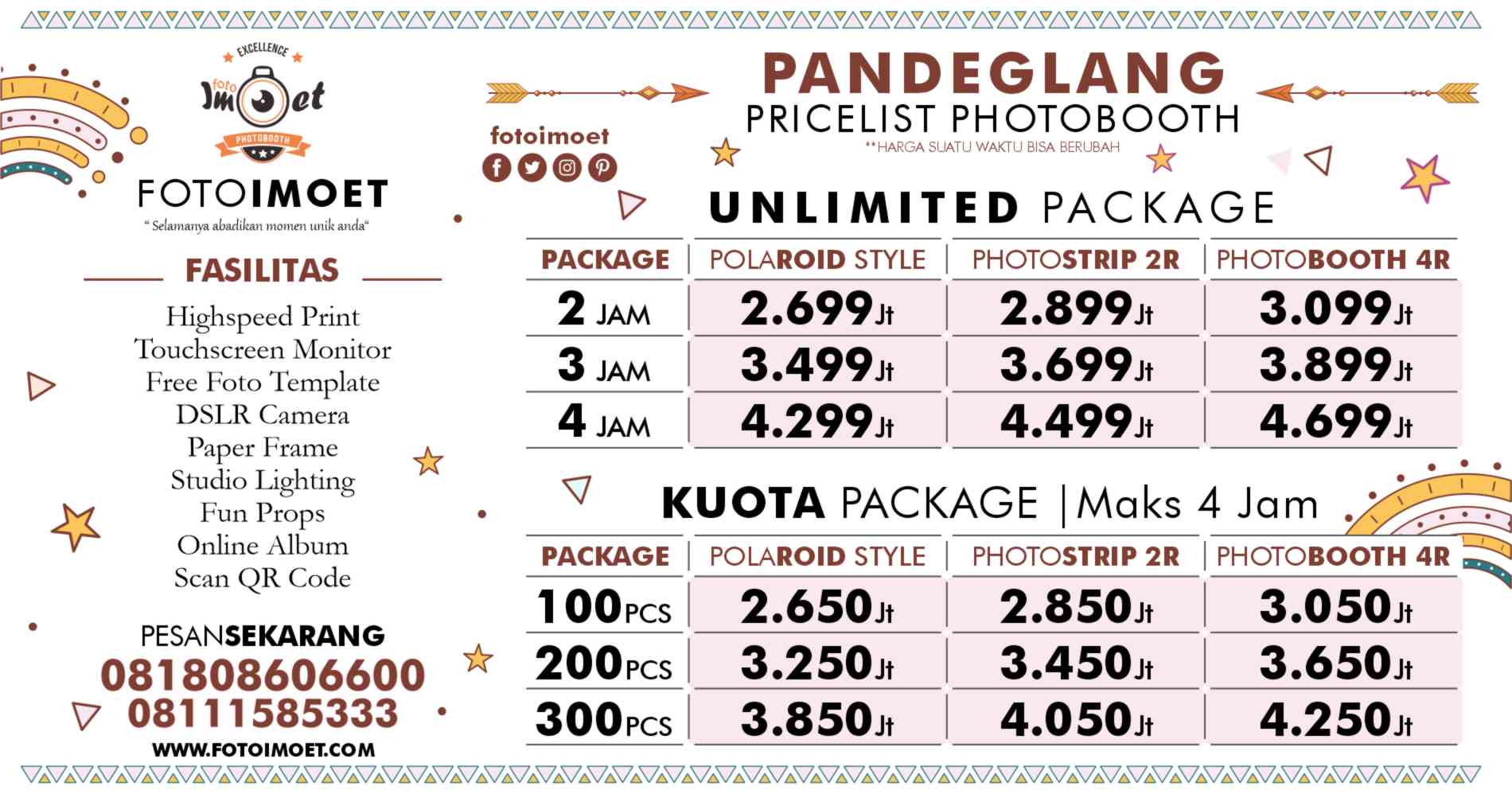 Pandeglang - Ada 2 layanan harga photo booth murah Pandeglang dari FOTOIMOET yaitu Paket photo booth unlimited dan Photo Booth Kuota, perbedaan nya ada di jam operasional dan banyak lembaran foto yang di cetak. Paket yang jumlah pemotretan tidak terbatas adalah photobooth unlimited, kamu bisa sepuasnya foto dan bergaya di depan kamera selama waktu operasional di paket harga photo booth unlimited Pandeglang yang di pesan.