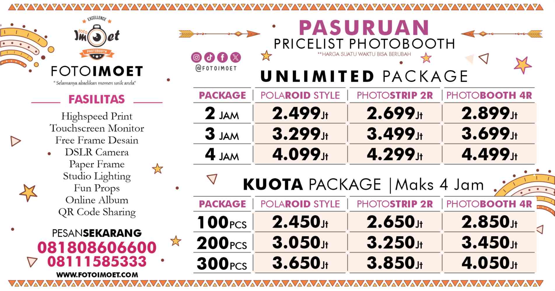 Pasuruan - Ada 2 layanan harga photo booth murah Pasuruan dari FOTOIMOET yaitu Paket photo booth unlimited dan Photo Booth Kuota, perbedaan nya ada di jam operasional dan banyak lembaran foto yang di cetak. Paket yang jumlah pemotretan tidak terbatas adalah photobooth unlimited, kamu bisa sepuasnya foto dan bergaya di depan kamera selama waktu operasional di paket harga photo booth unlimited Pasuruan yang di pesan.