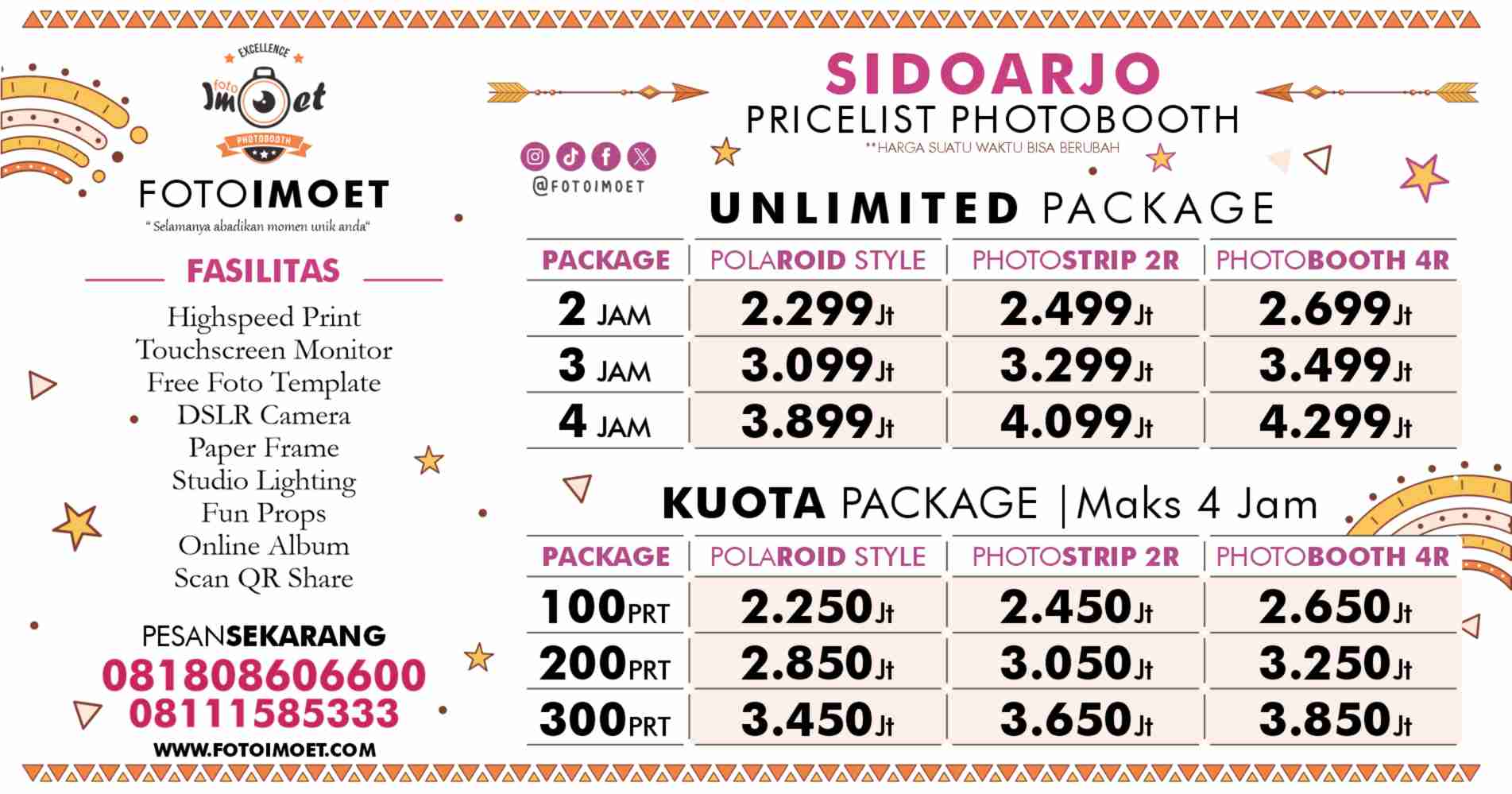 Sidoarjo - Ada 2 layanan harga photo booth murah Sidoarjo dari FOTOIMOET yaitu Paket photo booth unlimited dan Photo Booth Kuota, perbedaan nya ada di jam operasional dan banyak lembaran foto yang di cetak. Paket yang jumlah pemotretan tidak terbatas adalah photobooth unlimited, kamu bisa sepuasnya foto dan bergaya di depan kamera selama waktu operasional di paket harga photo booth unlimited Sidoarjo yang di pesan.