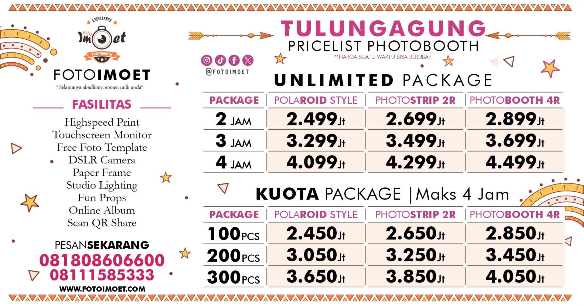 Tulungagung - Ada 2 layanan harga photo booth murah Tulungagung dari FOTOIMOET yaitu Paket photo booth unlimited dan Photo Booth Kuota, perbedaan nya ada di jam operasional dan banyak lembaran foto yang di cetak. Paket yang jumlah pemotretan tidak terbatas adalah photobooth unlimited, kamu bisa sepuasnya foto dan bergaya di depan kamera selama waktu operasional di paket harga photo booth unlimited Tulungagung yang di pesan.